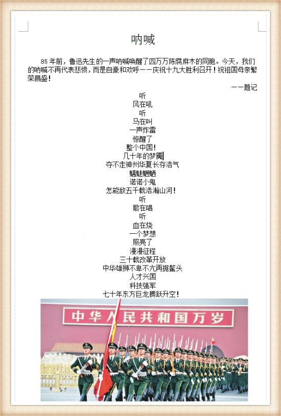 的同学们围绕十九大,创作出了优秀的作品,四位获奖同学的作品各有特色,张增帅同学的作品《祖国——我为你骄傲》,通过抒情优美的文字表达了对祖国的热爱之情,以作为一名中国青年而自豪,渴望为祖国的发展做出贡献。杜贺同学通过创作诗歌《呐喊》,抒发了对十九大胜利召开的激动之情。王聪同学的作品《从觉解中看冯友兰的人生境界》则结合十九大以及自身的阅读和生活经历探讨了许多深刻的感受。韦健飞同学的作品《关于科学技术》,则是以十九大精神为指导思想对我们的科学技术进行了深入的思考并写出了自己的感悟。此次征文比赛取得初步的成功,后续的活动还会陆续展开。