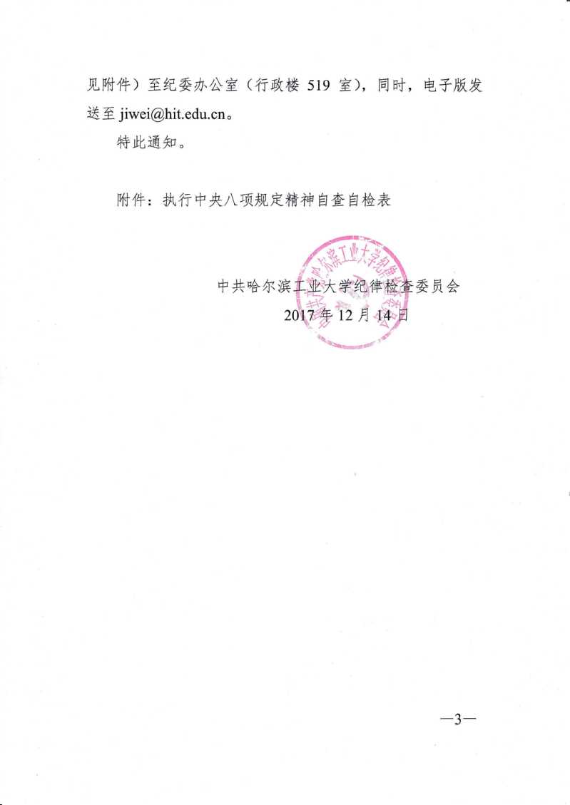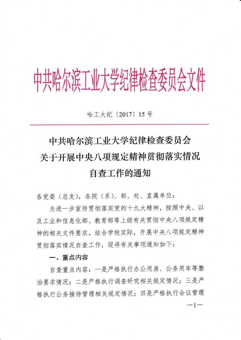 哈工大纪【2017】15号中央八项规定精神贯彻落实情况自查的通知