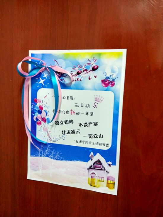学生组织联盟精心策划了此次送祝福活动,按照黑人av 教师办公室、学生寝室数量送达,覆盖节能楼、动力楼、电站楼、知源楼教师办公室98个,学生十五公寓、二公寓、四公寓寝室108个。考研前夜,在寝室门上为大四学生送上明信片,清晨看到祝福的大四学生甚至舍不得摘下,就带着满满信心奔赴考场;在新的一年里祝愿大家“平安、健康、快乐、进步”,是大三学长们早起为二公寓一楼学弟们贴满的心愿;大二学生曾卿丰激动地说:“看到了贺卡,我心中充满温暖和力量。我们一定会在新的一年里以更加积极的态度和饱满的热情勤奋学习,在实践锻炼中成长成才,报答父母、学校的抚育之恩,教养之情。”