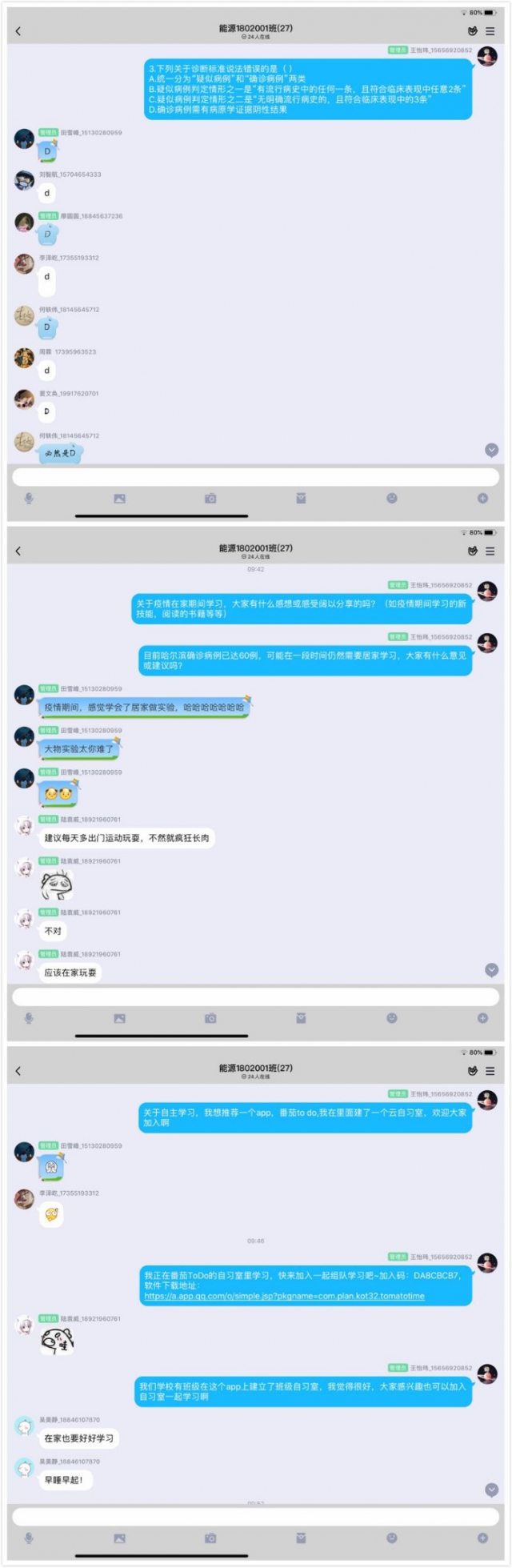 为增强广大团员抗击疫情的信心,展现团员青年居家学习的风采,4月26日上午,黑人av 1802001团支部在团支书王怡玮的组织下,有序开展了主题为“战斗团支部·居家抗‘疫’展风采”的线上团日活动。班级同学通过QQ群在线沟通交流,积极参与到传染病防控与防疫知识竞答的活动中,并在活动后积极交流疫情期间居家学习方面的经历与感受,分享自己的防疫心得和思想收获。
