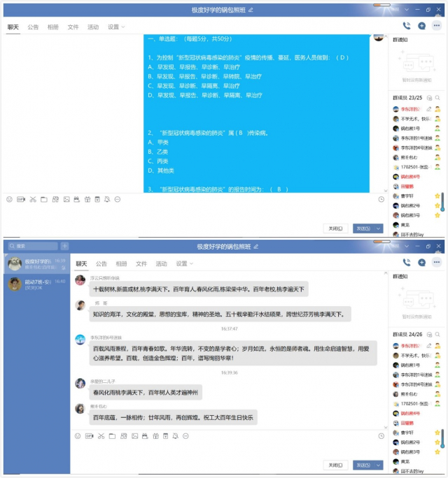 本次活动的形式为QQ群线上交流讨论。首先,由团支书带领同学们一起回顾往期青年大学习主题团课。其次,由班长进行抗击疫情演讲,并带领同学们学习抗疫相关的知识。随后,进行防疫知识问答活动,同学们对学到的防疫知识进行巩固,增强了抗击疫情的信心。最后,由团支书与大家讲述“我与哈工大的故事”,动员大家主动学习哈工大历史,向百年哈工大“云”寄相思和“云”传祝福。